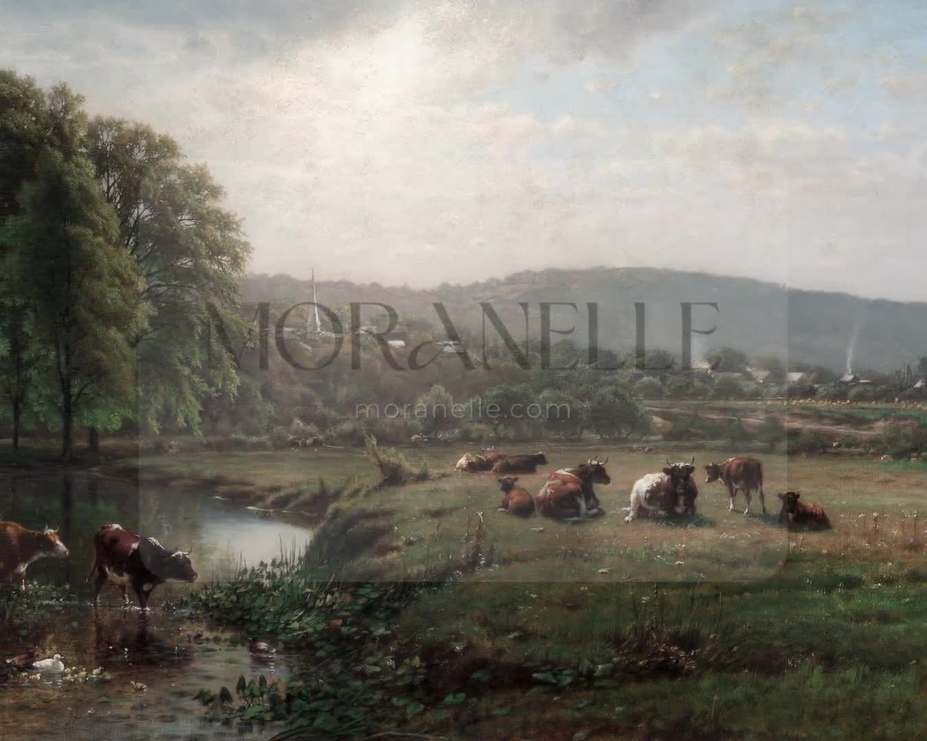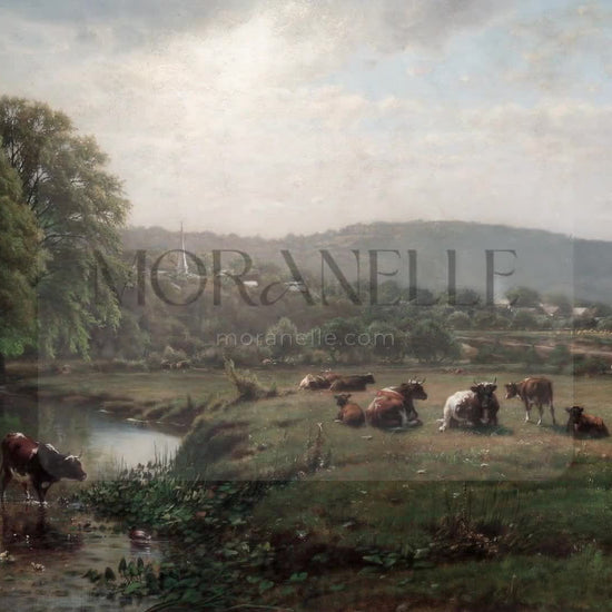 This serene pastoral landscape features a tranquil scene with cows grazing near a calm stream, surrounded by lush greenery and distant hills. The soft lighting and natural elements create a peaceful atmosphere, perfect for those who appreciate rural beauty and nature-inspired art.