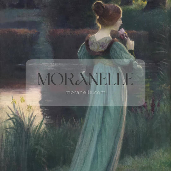 A woman in a long teal dress pauses at the edge of a pond, holding a single blossom to her lips as if lost in an unspoken thought. Evening light glows on the water behind her, framed by deep greens, soft shadows, and gentle brushwork. Created in 1893, Reminiscing by a Pond reflects Armand Point’s devotion to elegance, memory, and the poetry of a lonely moment.